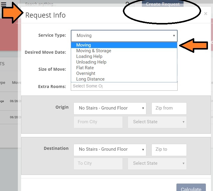 On Origin and Destination, you choose the zip codes and additional information. (Is there an elevator or not? )