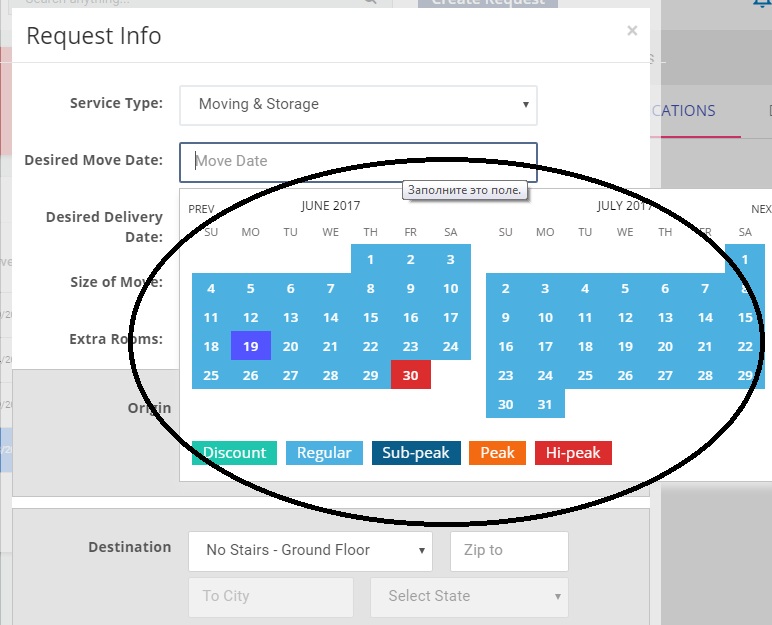 In Desiring Move Date you can check the date of moving in a calendar. Also, you can set up the flags about the hi-peak period or the regular days. And if you choose the hi-peak day, the price of the request will be higher than if it would be the normal day.